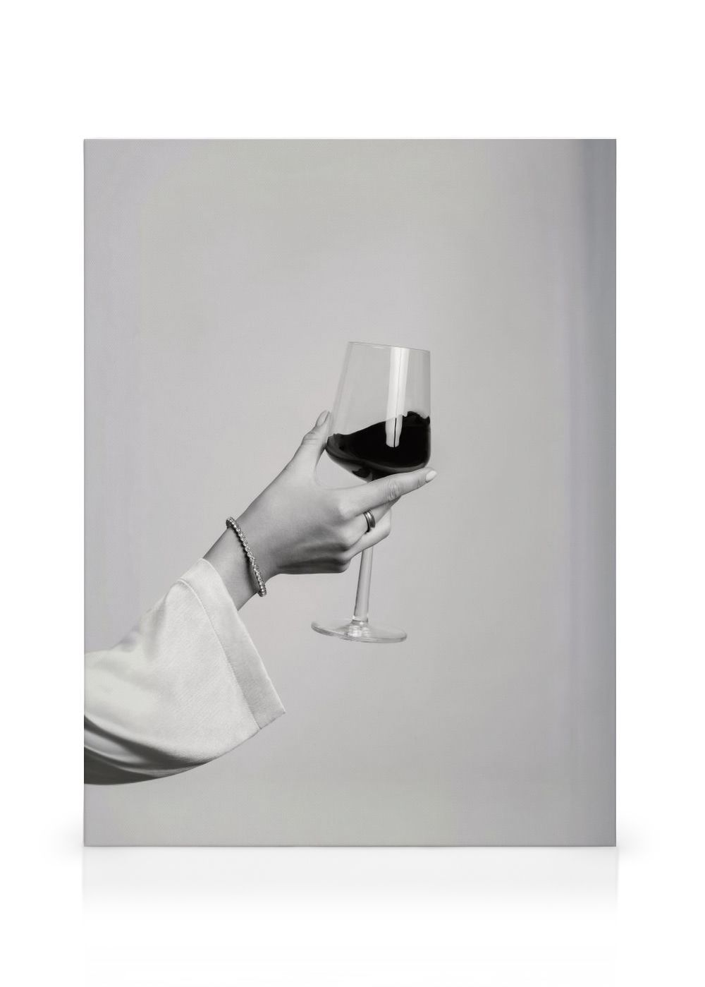 Cette toile en noir et blanc montre une main avec des bijoux tenant un verre de vin. Simple et élégant.