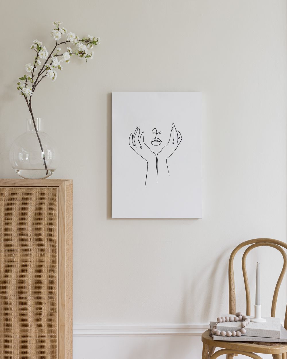 À partir de 11.07 CHFCette toile minimaliste noir et blanc présente un dessin au trait d'un visage et de mains. Un style simple et élégant pour votre mur.