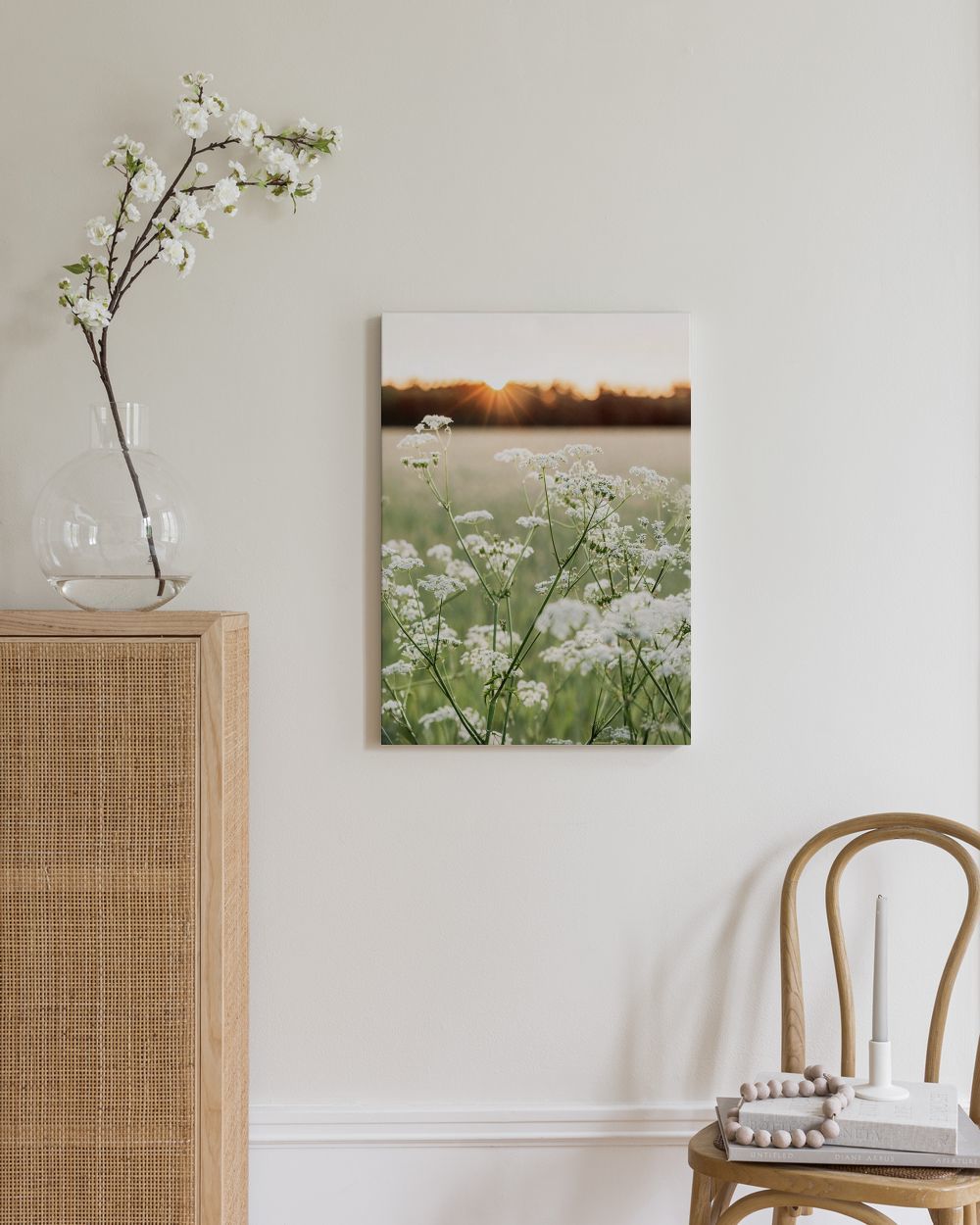 Da CHF 11.07Una stampa su tela che mostra delicati fiori selvatici bianchi contro un cielo al tramonto. Questo motivo crea una scena naturale pacifica con colori caldi.