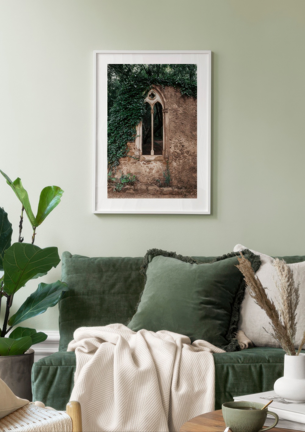Foto di una finestra nella foresta circondata da alberi. La stampa realistica perfetta da aggiungere al soggiorno o alla camera da letto.