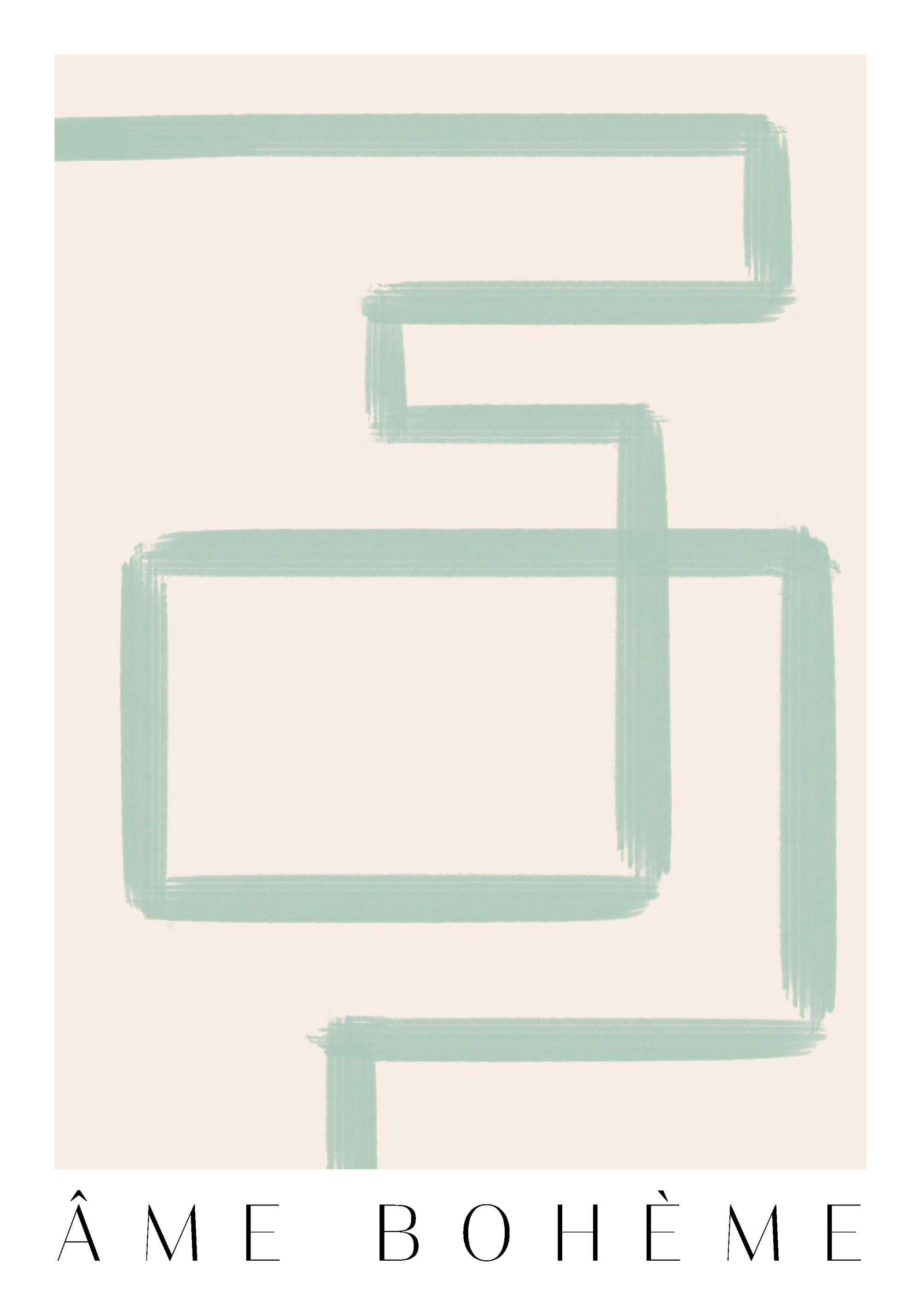 Abstraktes Poster mit grünen Linien und einem beigen Hintergrund mit dem Text: "Ame Boheme" in schwarz. Dieses Poster wird deinem Zuhause einen modernen und trendigen Touch verleihen. Kombiniere es mit dem Ame Boheme No2 Poster.