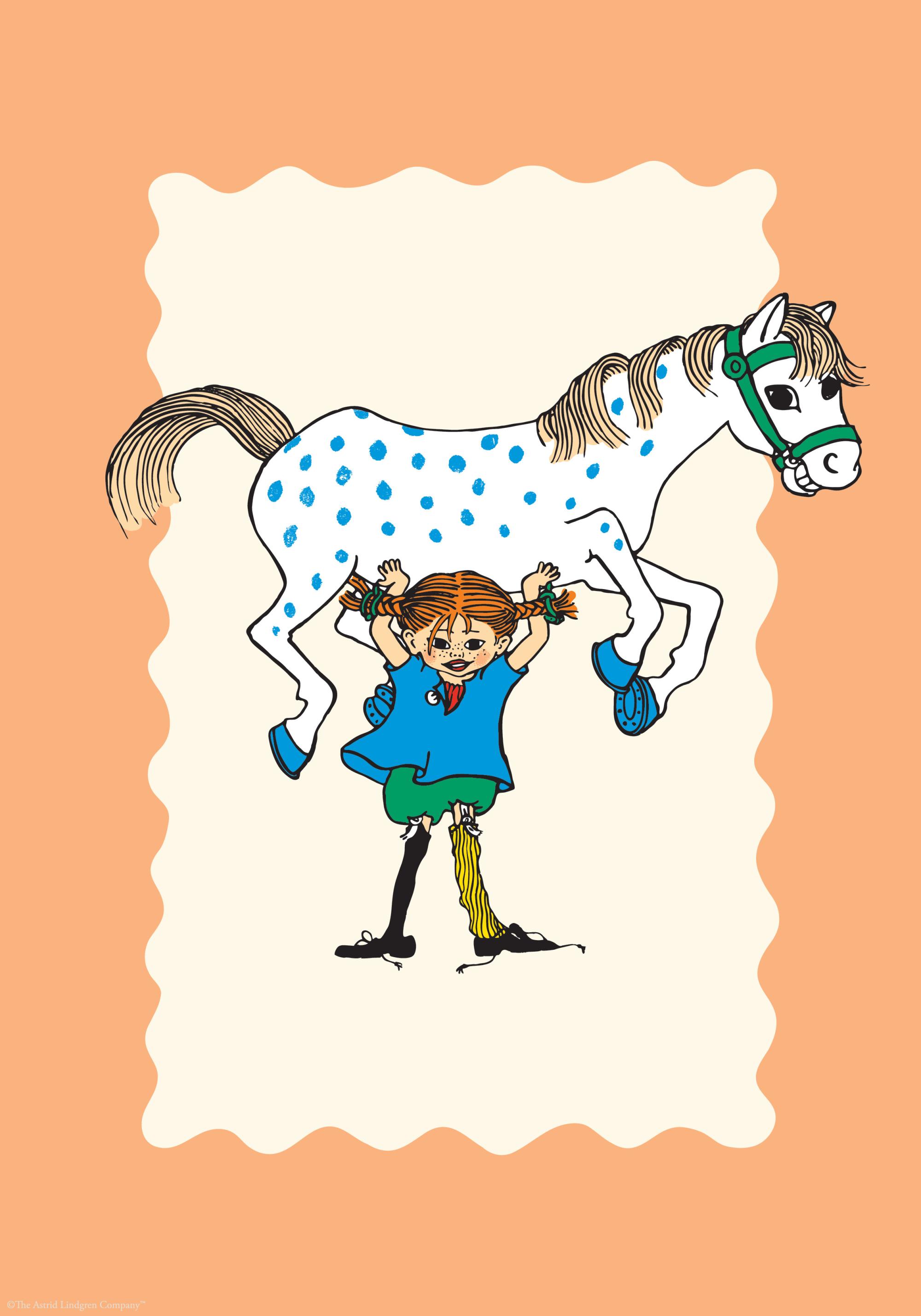 Ab CHF 5.22Ein lustiges Poster von Pippi Langstrumpf, wie sie ihr getupftes Pferd hochhebt. Sie hat rote Zöpfe und trägt verschiedenfarbige Socken!