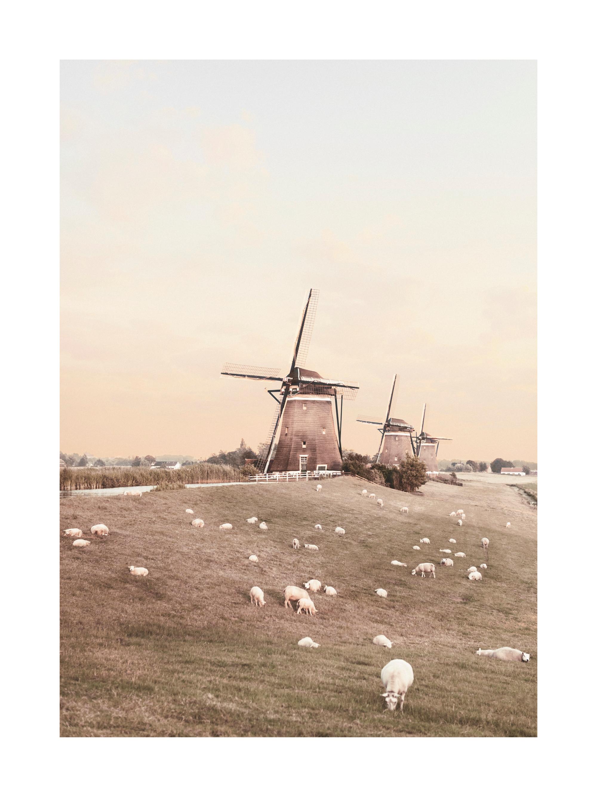 Ab CHF 12.92Fotografie von Windrädern and Schafen auf einer Wiese vor dem Sonnenuntergang. Dieses Poster hat eine körnige Fotostruktur. Das Poster bringt ein rustikales Feeling in dein Zuhause.