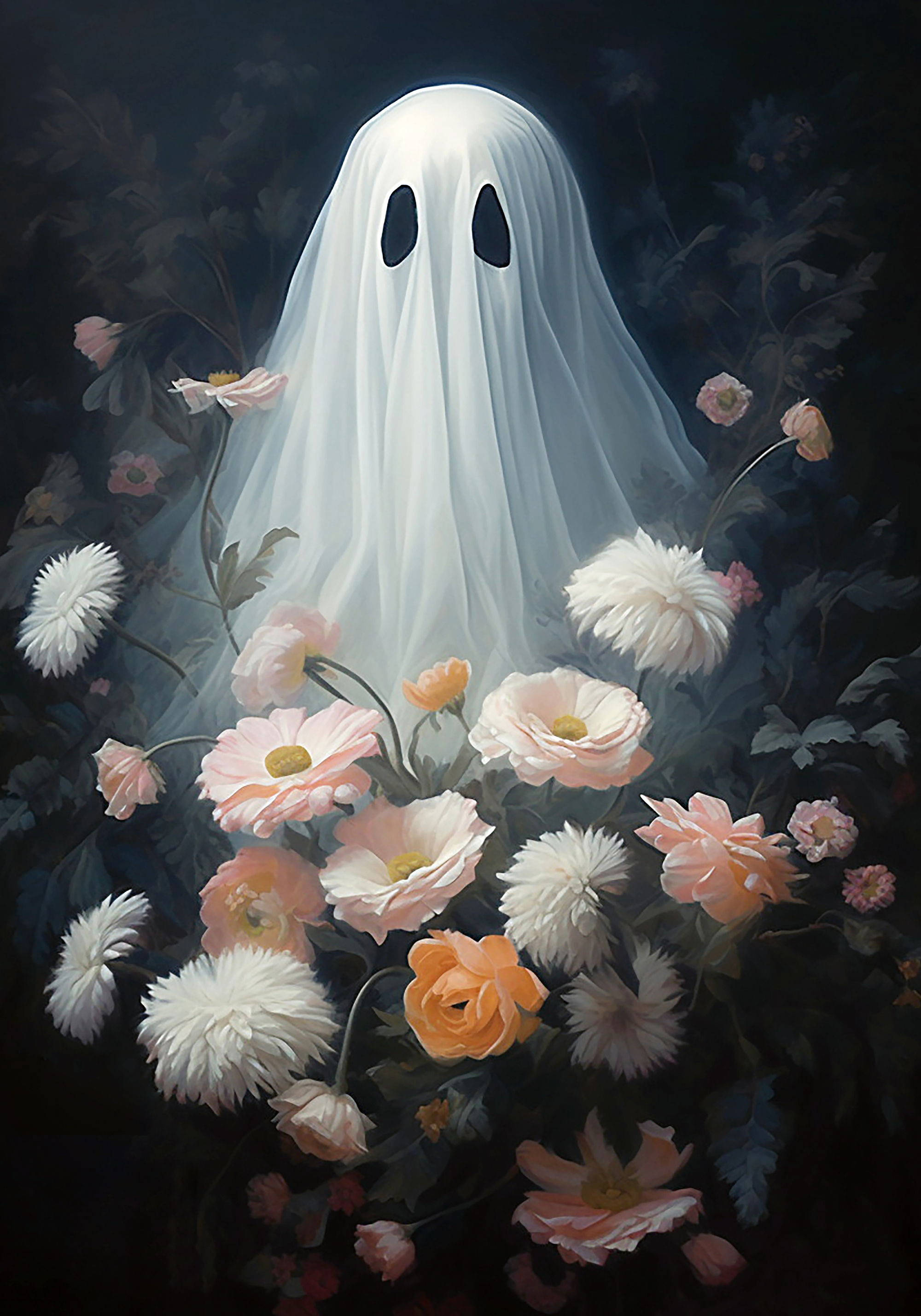 Ein geheimnisvolles Poster mit einer Geisterfigur zwischen bunten Blumen in Pink, Weiß und Orange. Die dunklen Blätter setzen einen schönen Kontrast zu den hellen Blüten.