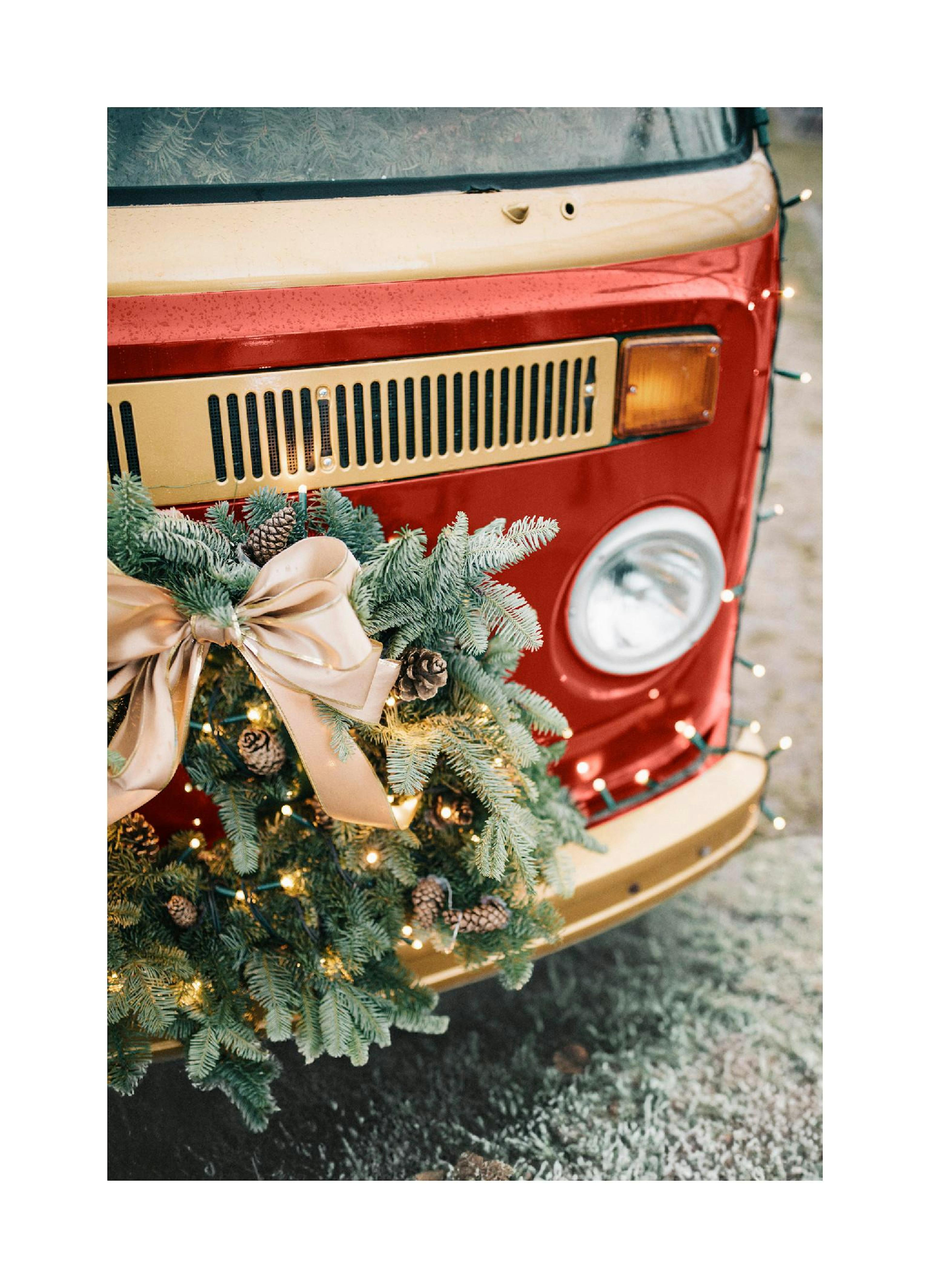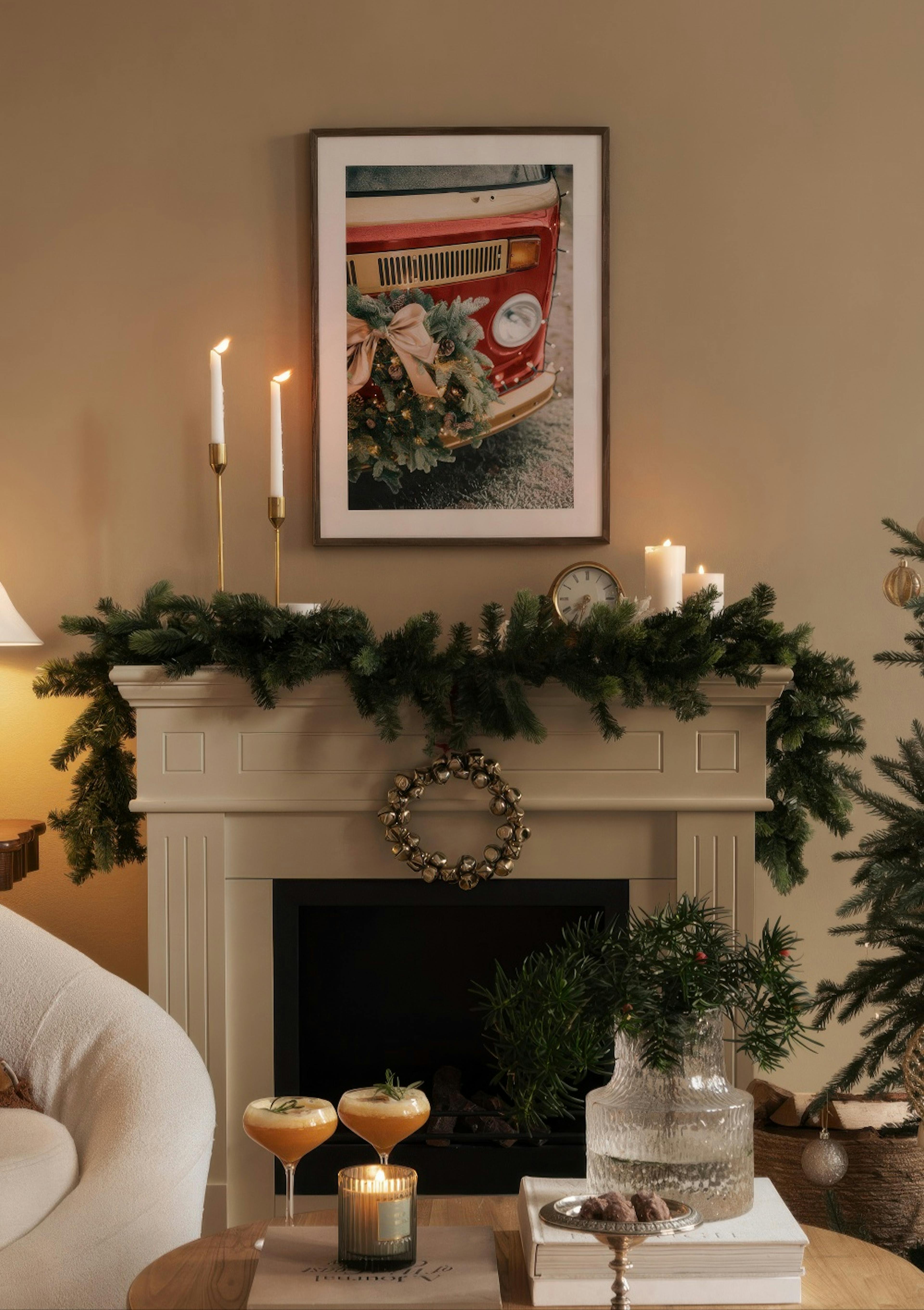 Festliches Poster, das einen Weihnachtsbus mit einem grünen Kranz, Zapfen und Lichtern zeigt, was eine gemütliche Weihnachtsszene für deine Wand kreiert.